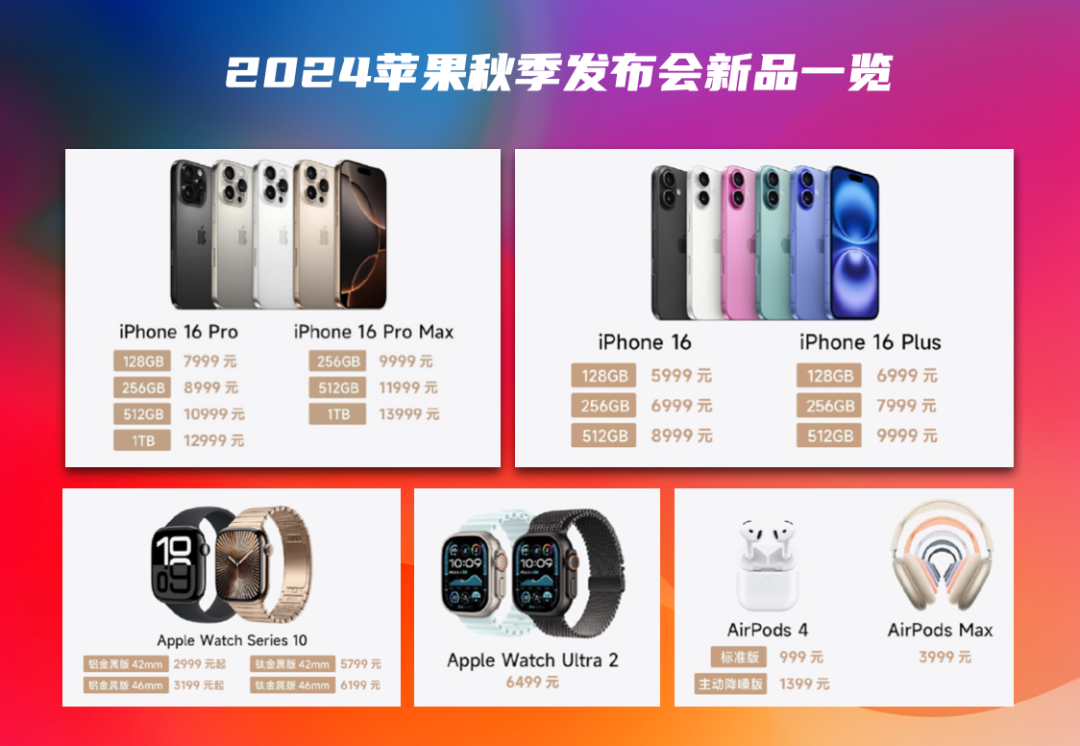 以iPhone为例,新款依然是4种机型,分别是数字版的iPhone 16和iPhone 16 Plus、Pro系列的iPhone 16 Pro和iPhone 16 Pro Max。