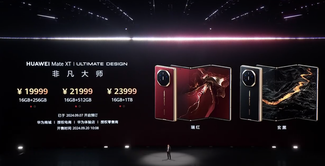 售价方面,Mate XT非凡大师按存储空间分为三个版本,售价分别为19999元、21999元、23999元。9月20日正式开售,依然是与苹果同天。
