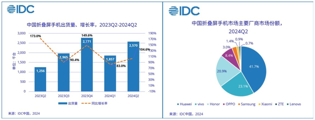 自2019年华为发布国内首款折叠屏产品HUAWEI Mate X系列以来,国内折叠屏手机市场连续实现同比增速超过100%。据市场研究机构IDC数据,2024年上半年中国折叠屏手机市场出货量累计达到443万台,华为以约189.2万台出货量占据42.7%市场份额,位列出货量第一。