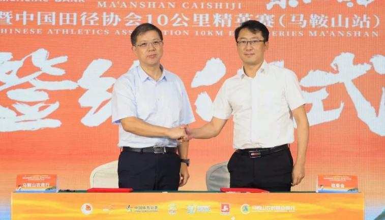 江东文旅集团董事长范文江代表组委会与马鞍山农村商业银行和安徽省体育彩票管理中心签约。