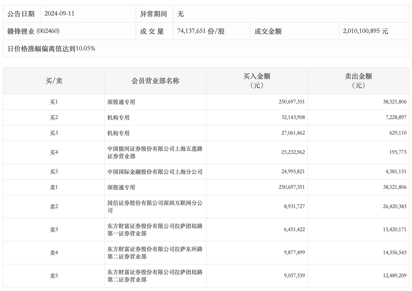 9月11日,赣锋锂业今日涨停,成交额20.10亿元,换手率6.13%,盘后龙虎榜数据显示,深股通专用席位买入2.51亿元并卖出3852.18万元,二机构专用席位净买入5134.74万元。