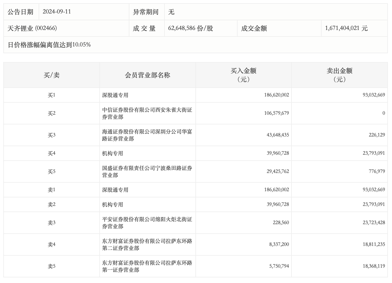 9月11日,天齐锂业今日涨停,成交额16.71亿元,换手率4.24%。龙虎榜数据显示,中信证券西安朱雀大街净买入1.07亿元,深股通专用席位买入1.87亿元并卖出9303.27万元,一机构专用席位净买入1616.76万元。