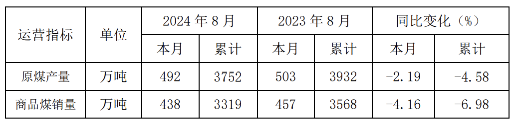 潞安环能9月11日公告,2024年8月原煤产量为492万吨,同比下降2.19%;商品煤销量为438万吨,同比下降4.16%。