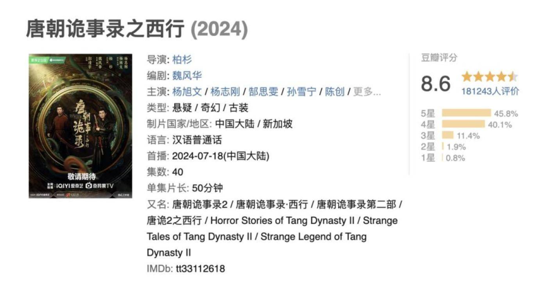 具体来看,虽然上半年的《追风者》热度破万,但该剧在云合集均有效播放只有3571万;《我的阿勒泰》顺利破圈,且有效带动了当地文旅,但仅仅8集的迷你剧,实在难以让热度持续,很快便被其他平台的热门剧抢走了流量和热度;“大流量+大动漫IP”古装玄幻剧《狐妖小红娘·月红篇》试与腾讯视频的《庆余年2》对抗,但热度却一路走低,甚至引起大量吐槽,云合数据显示,《狐妖》剧集集均V7有效播放量仅为736万;《唐朝诡事录之西行》其实口碑和播放量不错,但和此前的《追风者》一样,热度破万来得太晚……要知道,2023年的《狂飙》开播一周就跨过了热度破万的门槛。