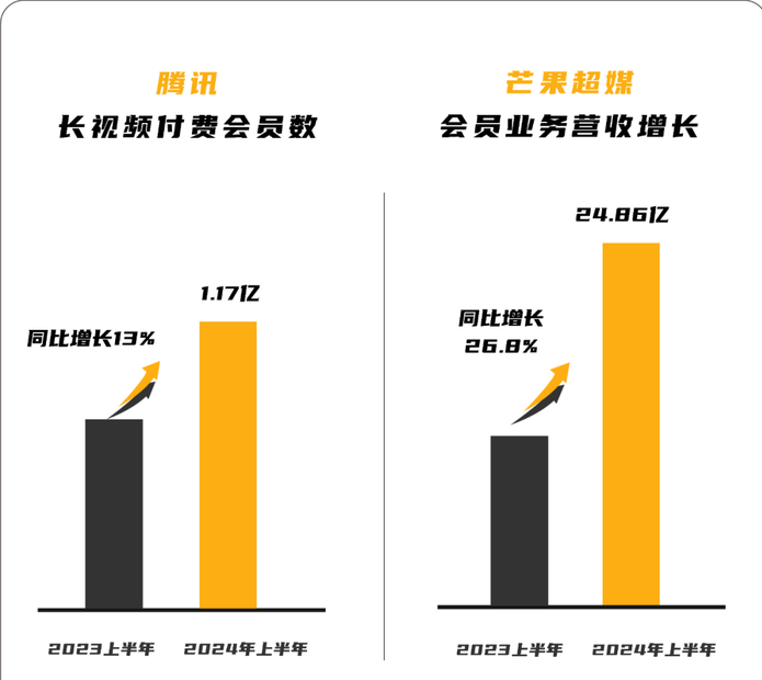 但另一边,根据公开财报显示,今年上半年,腾讯长视频付费会员数同比增长13%至1.17亿,芒果超媒会员业务收入24.86亿元,同比增长26.8%。