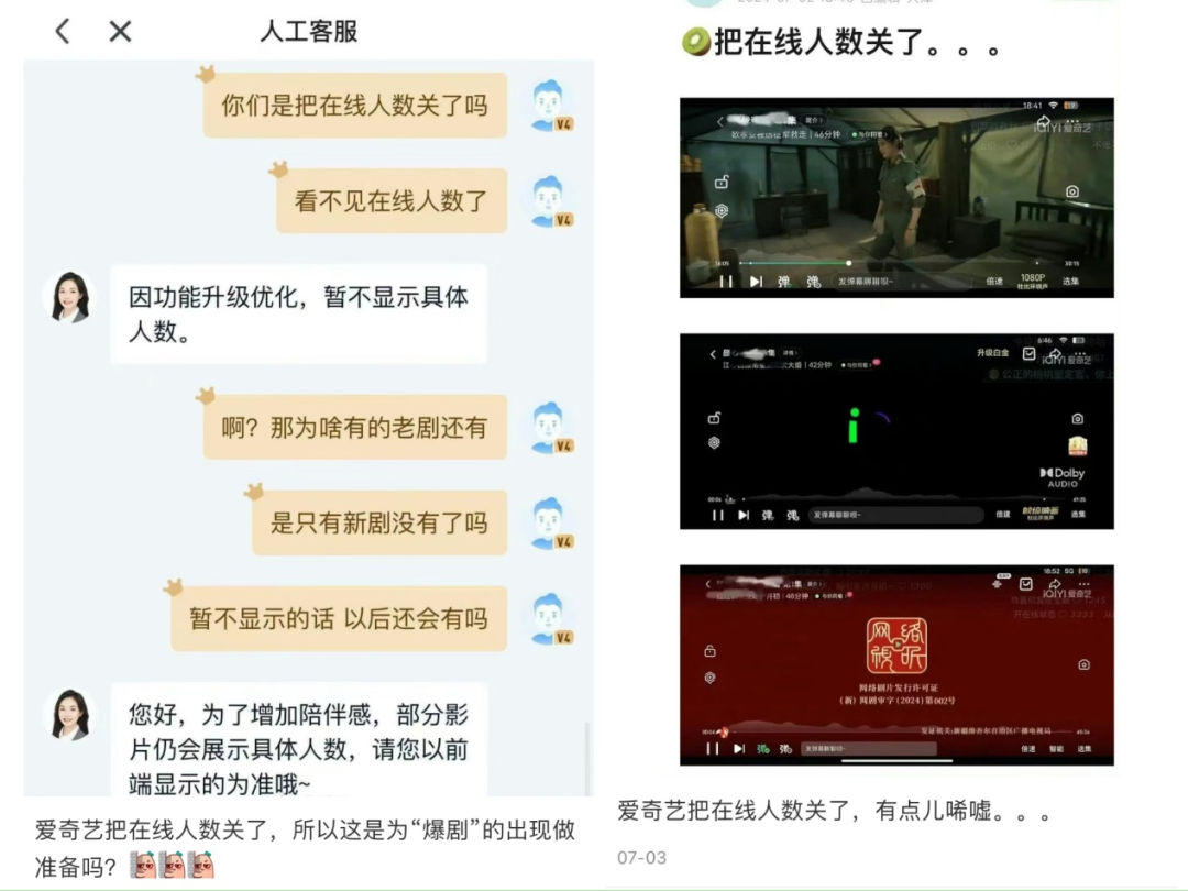 对此,爱奇艺客服解释称,由于平台正在进行功能升级和优化,因此暂时不显示具体的在线人数。同时,爱奇艺表示,为了增强用户的观影体验和陪伴感,部分影片仍然会显示具体的人数,但具体情况以前端显示为主。