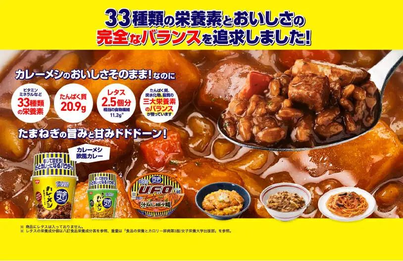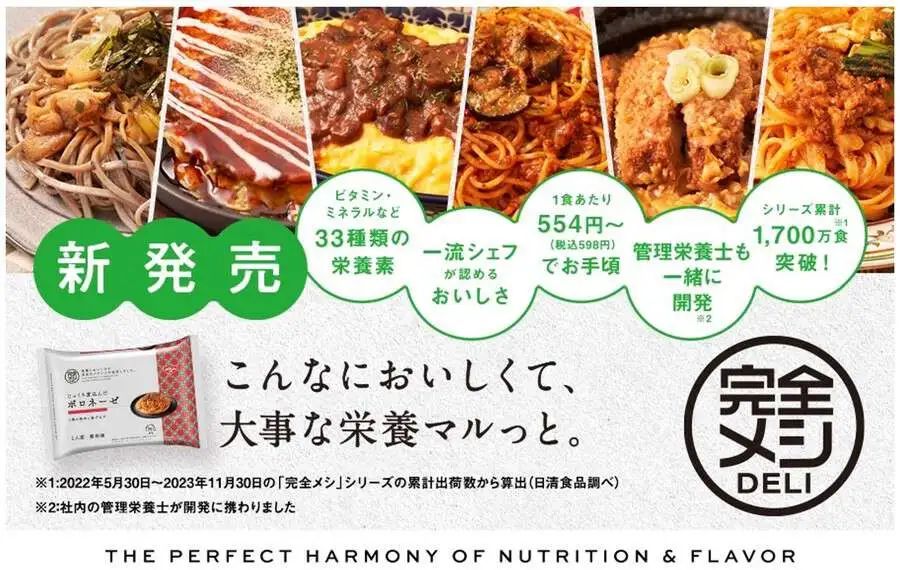 这就是日清食品在2022年5月推出的“全营养餐”(完全メシ)食品新品牌,该品牌旗下每款产品都可以提供每日人体所需1/3的33种营养成分。
