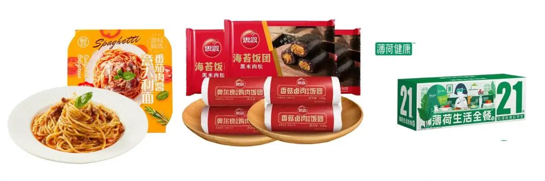 比如盒马为加班人群推出的,2分钟速享番茄肉酱意大利面,方便快捷且营养均衡;还有思念食品公司专门为打工人推出的营养早餐——速食饭团等。