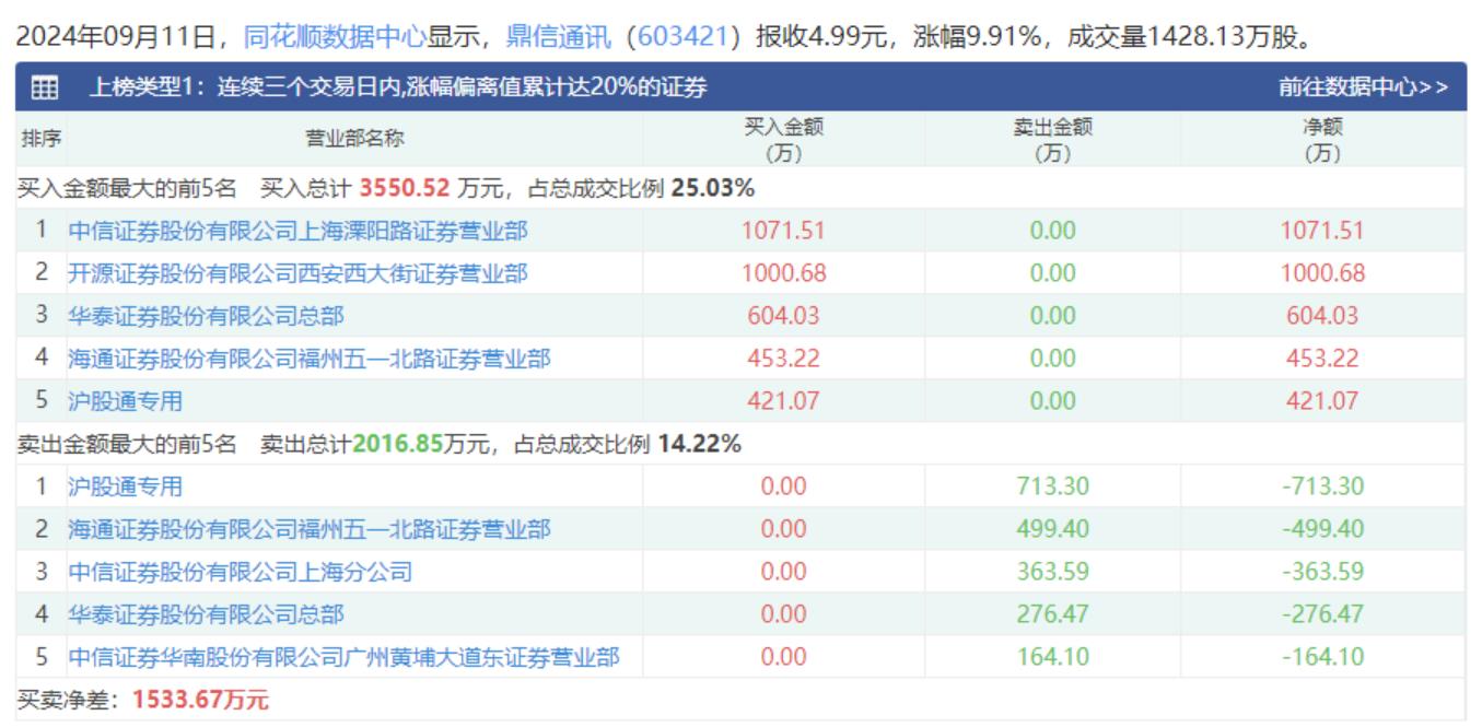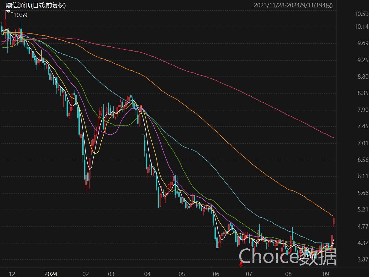 9月11日早盘,鼎信通讯股价大幅高开6.61%,开盘一分钟即封涨停板。截至收盘时,鼎信通讯上涨9.91%,报4.99元/股,连续两个交易日累计涨幅达20.82%。