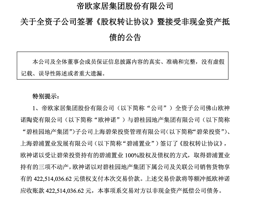 截至9月9日,连同本次与碧桂园拟实施的相关事项,帝欧家居与相关债务人在过去12个月内发生的以资抵债金额达到了约6.82亿元。