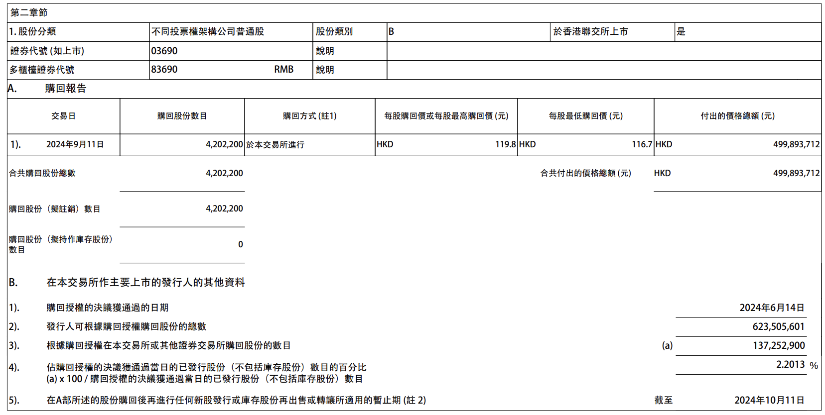 美团9月11日在港交所公告,于当日回购了420.22万股B类股份,耗资约5亿港元,每股回购价格116.7港元-119.8港元。