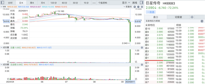 具体而言,9月11日,巨星传奇的股价在多次触发市场调节机制后,以72.24%的跌幅收盘于2.59港元,市值骤降至约21.58亿港元,单日市值蒸发超过50亿港元。这一收盘价也标志着巨星传奇自2023年7月香港上市以来,首次跌破其首次公开发行价格。此前的交易日中,其收盘价还维持在9.33港元的高位。