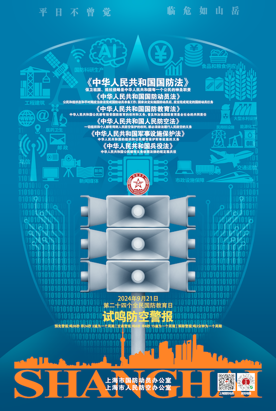为增强国防观念、提高人防意识、普及人防知识、提升民众的自救互救能力,上海市将于2024年9月21日全民国防教育日当天在全市范围内(除浦东、虹桥国际机场区域外)组织防空警报试鸣。同时,上海市国防动员办公室(以下简称“市国动办”)将组织开展一系列防空演练和国防教育活动,全面提升民众疏散掩蔽能力和人防专业队伍救援能力。