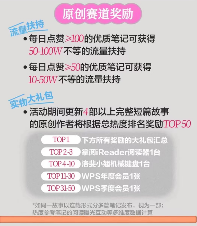 除流量扶持外,小红书当前暂未提及稿费制度,而是在活动期间向更新4部以上完整短篇故事的原创作者根据总热度排名提供阅读器、机械键盘、WPS会员等实物大礼包。