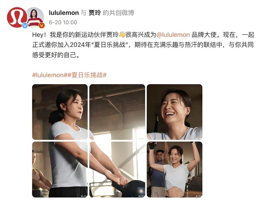 实际上,Lululemon为了进一步释放中国市场的巨大潜力,也曾砸下了重金。例如,前不久的6月20日,贾玲又多了一个头衔,正式成为运动生活方式品牌lululemon的品牌大使,并且号召大家一起参与“夏日乐挑战”。很显然,这得益于此前贾玲自导自演的电影《热辣滚烫》,通过饰演杜乐莹塑造的励志人设。