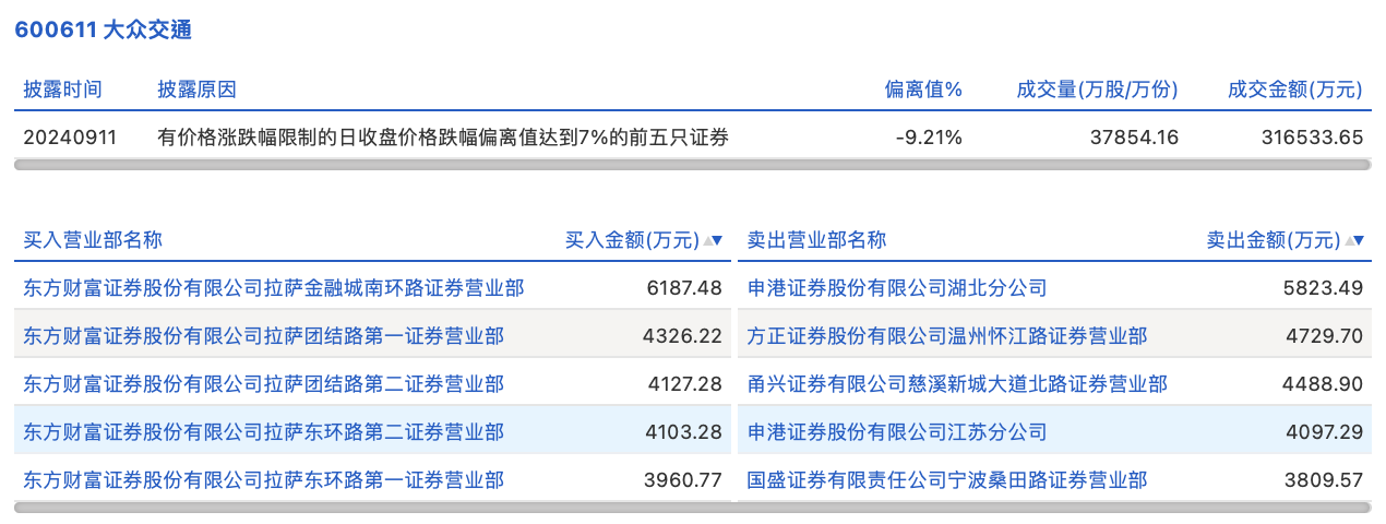 9月11日,大众交通今日跌停,龙虎榜数据显示,上榜营业部席位全天成交4.57亿元,占当日总成交金额比例为14.42%。其中,买入金额为2.27亿元,卖出金额为2.29亿元,合计净卖出243.92万元。