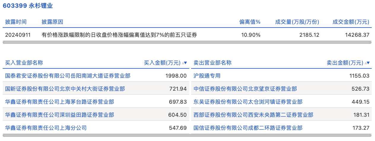 9月11日,永杉锂业今日涨停,龙虎榜数据显示,上榜营业部席位全天成交7055.46万元,占当日总成交金额比例为49.45%。其中,买入金额为4569.97万元,卖出金额为2485.49万元,合计净买入2084.48万元。