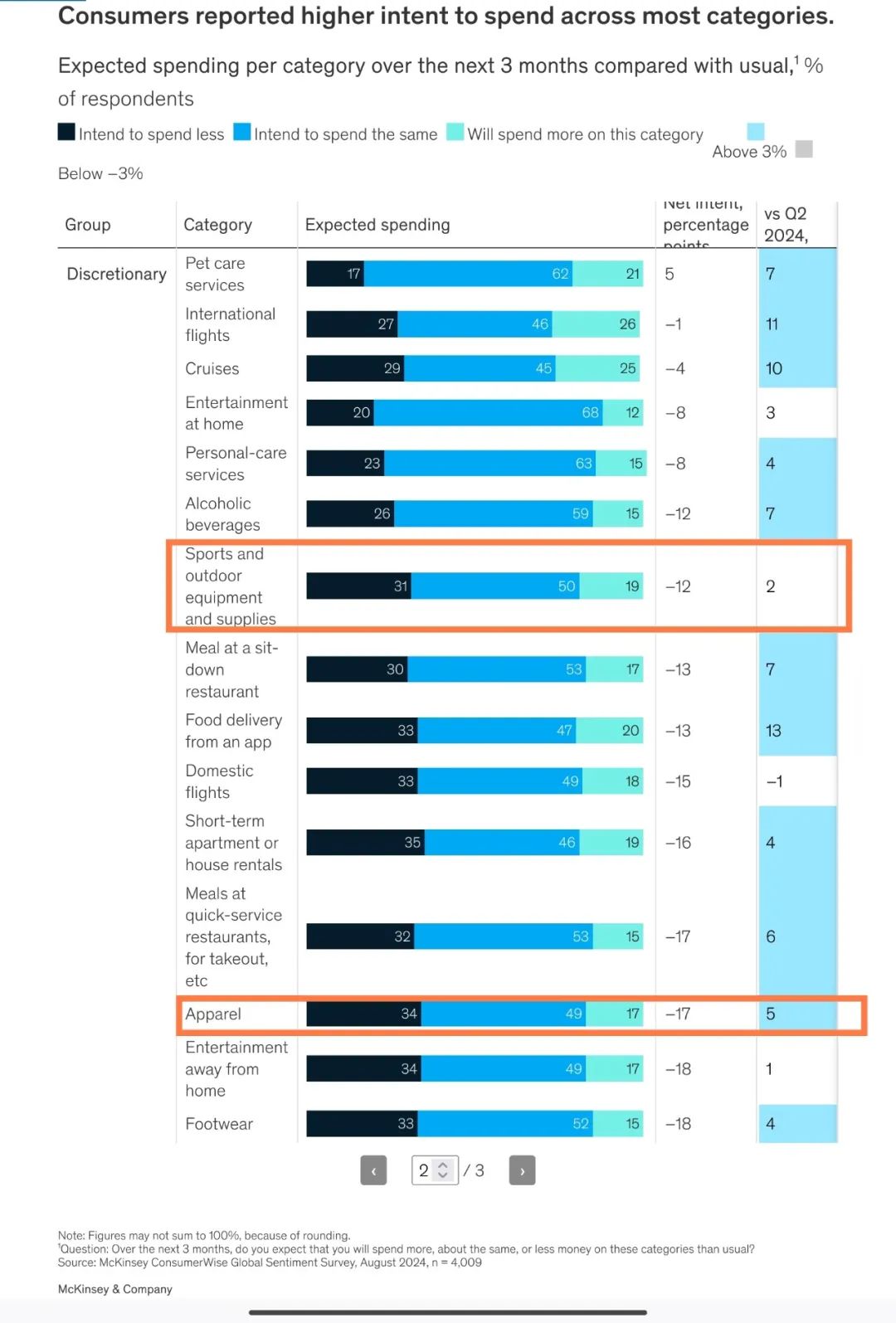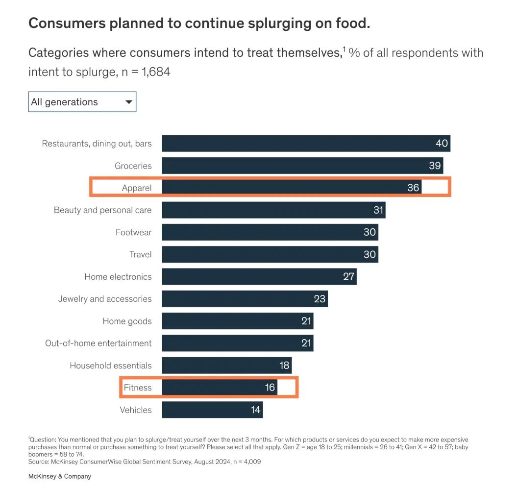 但麦肯锡8月的最新调研也显示了积极的一面:消费者2024年三季度的消费意愿有所回升。然而对于运动健身设备这类“酌情”购买的商品的意愿只比二季度提升了2%。服装稍好,提升了5%。
