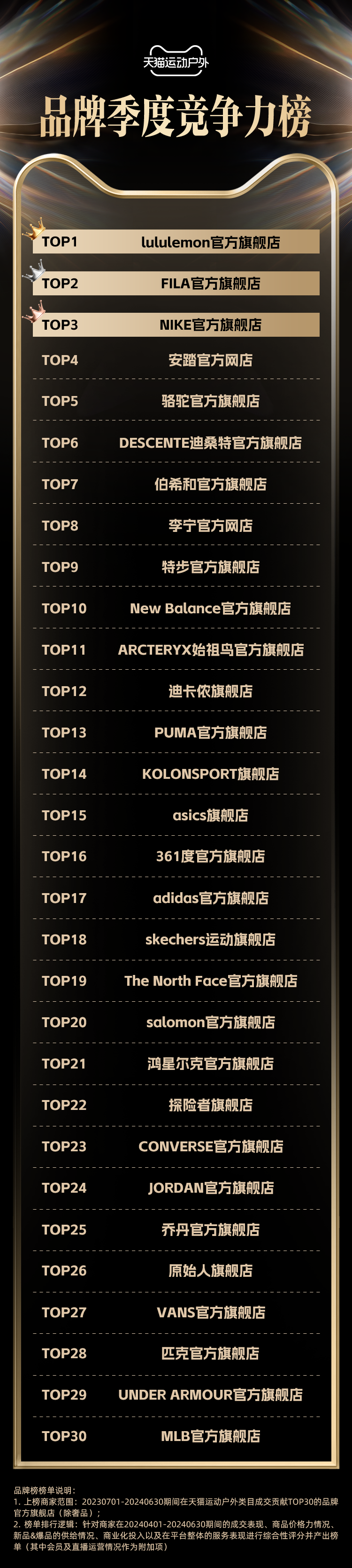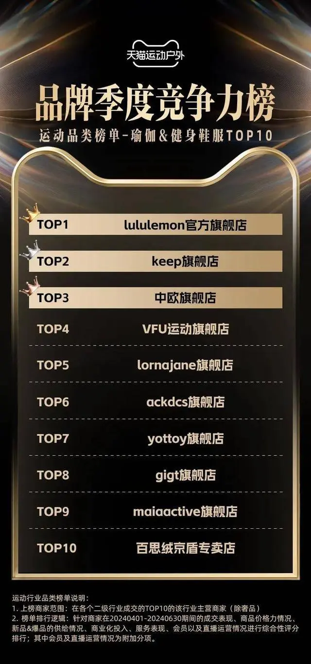 从天猫2024年二季度运动户外榜单来看,lululemon在总竞争力榜以及瑜伽和健身鞋服类榜上还把着第一的位置。