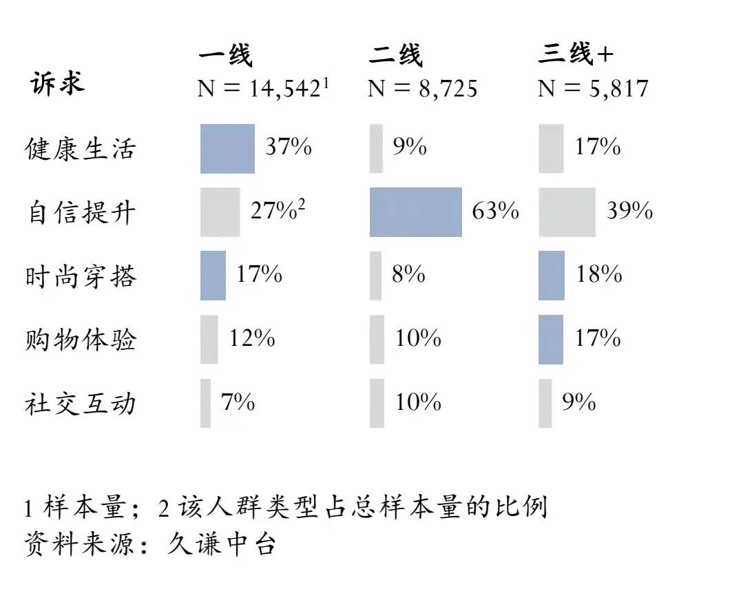 但下沉市场的挑战在于,消费降级的欲望总体依然高过消费升级。然而如果关注到特定的消费心理,还是能帮品牌守住市场。从久谦中台的调研可知,lululemon消费者购买该品牌的一个重要原因,就是通过高端品牌提升自信,尤其是二线城市消费者,他们倾向通过这个品牌展示个人风格和生活态度;三线及以下城市消费者则把lululemon视为提升自信心和美丽的重要工具。