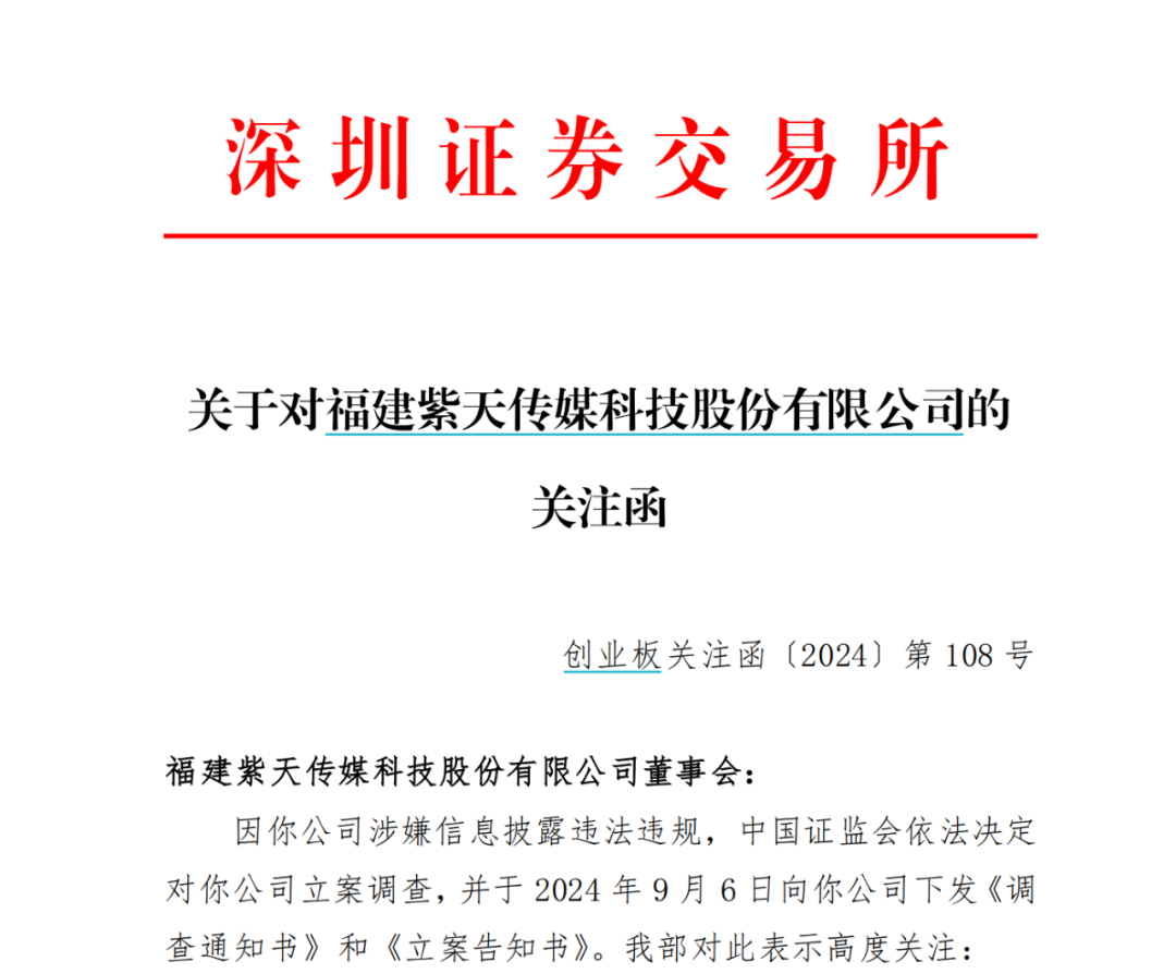上述公告还同时披露了深交所督促紫天科技立即就被立案进行信披的《关注函》,其中并未详述被立案的具体原因。而截至发稿前,距离收到关注函已过去4天有余,紫天科技仍未进行专门披露。