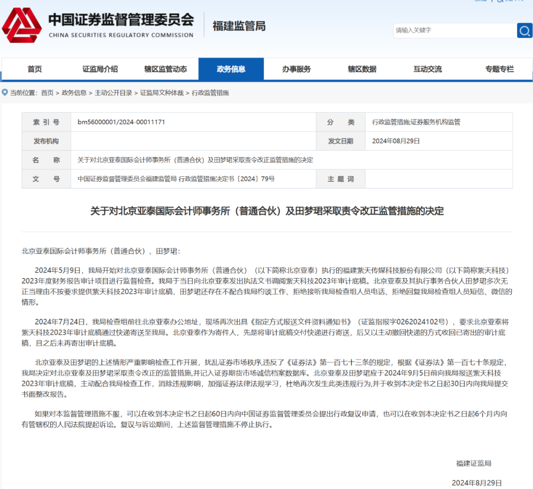 被监管“包围”的还不仅是紫天科技。祸起紫天科技2023年报,负责该项审计的北京亚泰国际会计师事务所(普通合伙)(下称:北京亚泰)及其执行事务合伙人,近日也因不交底稿、多次拒绝沟通等,被福建证监局采取责令改正监管措施。