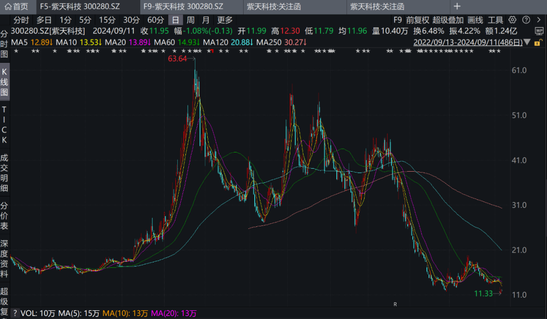 在监管的接连敲打下,紫天科技的股价也在波动中下行,尤其是2023年年报被监管重点关注以来,以及这次被立案,其股价更遭遇重挫。