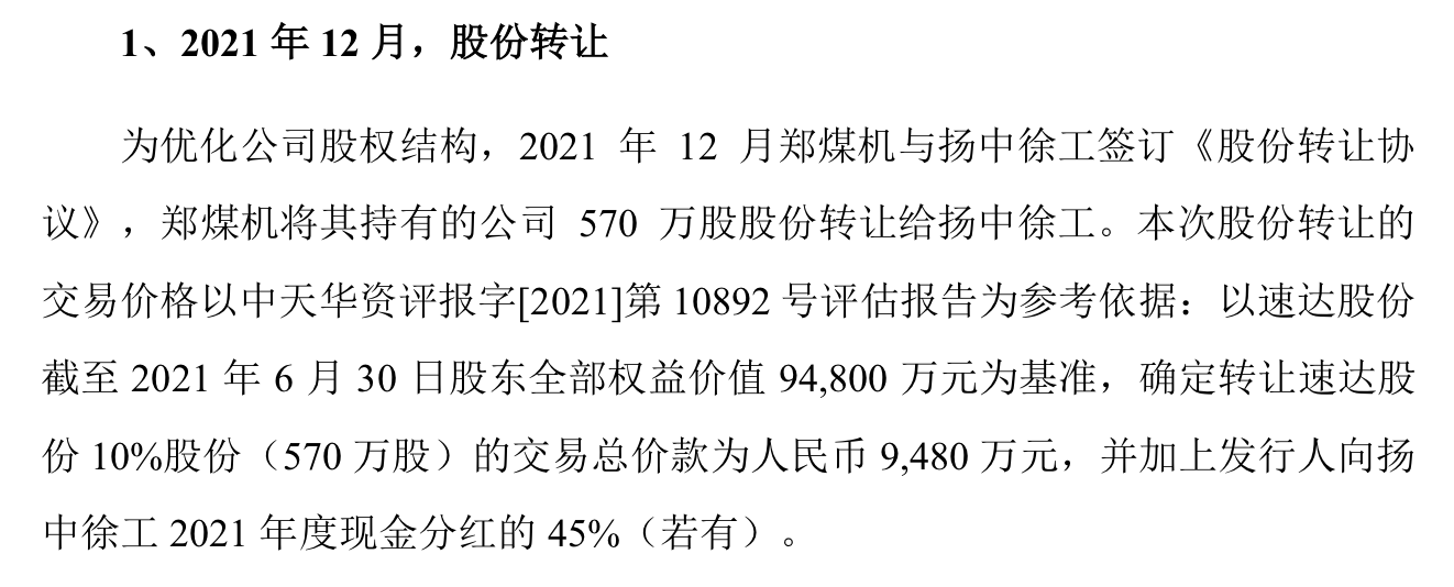 根据说明书,扬中徐工当时以9480万元受让570万股。受让当年(2021年)速达股份现金分红3021万元。单算9480万元的对价,扬中徐工接手成本只有16.63元/股,远低于发行价。可见扬中徐工这笔投资账面浮盈不错。