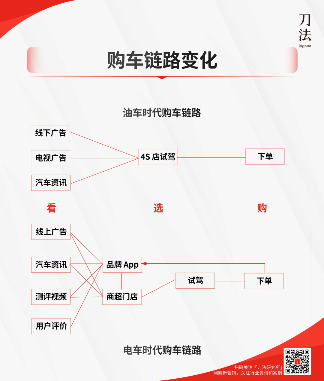 油车时代,车企与消费者的沟通链路简单、直观;电车时代,或者说互联网背景的新势力入局后,线上线下转化链路逐渐多元化。