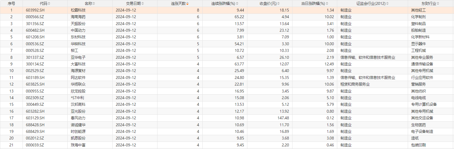 Choice数据统计,今日1只个股连续8天上涨,为松霖科技;4只个股连续6天上涨,包括海南海药、中国动力等;此外,华映科技、柳工、亚华电子3只个股连续5天上涨;大富科技、网达软件、中国海防等连续4天上涨。