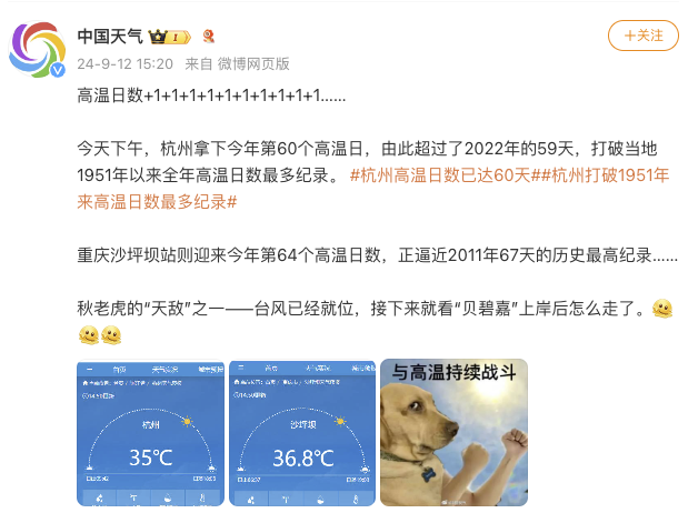 今天下午,杭州拿下今年第60个高温日,由此超过了2022年的59天,打破当地1951年以来全年高温日数最多纪录。