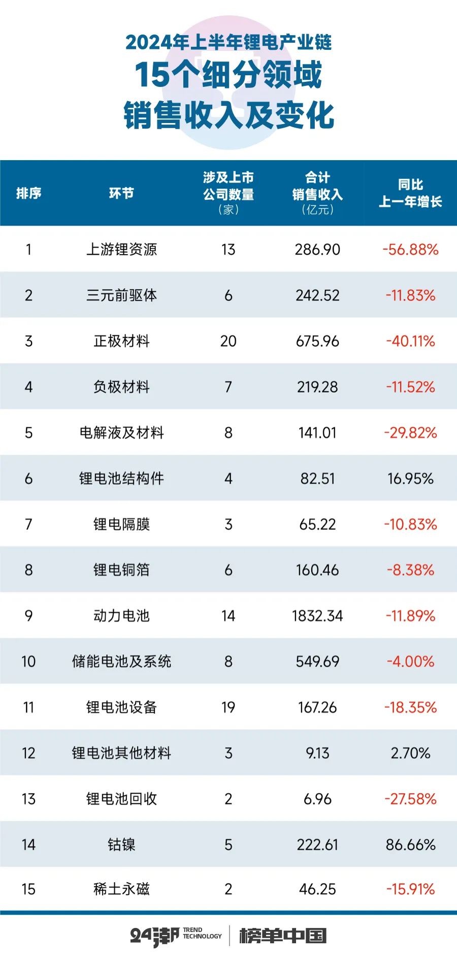 具体到15个锂电细分产业链,上半年10个细分产业链营业收入降幅在10%以上,下降最快的三个细分领域上游锂资源(营业收入同比下降56.88%)、正极材料(下降40.11%)、电解液及材料(下降29.82%)。
