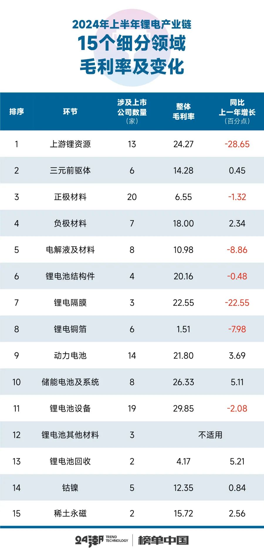 在盈利层面,锂电产业两极分化现象已是极为严重,上半年有7个细分产业毛利率出现下降,其中下降最快的三个细分领域为上游锂资源(毛利率下降28.65个百分点)、锂电隔膜(下降22.55个百分点)、电解液及材料(下降8.86个百分点)。