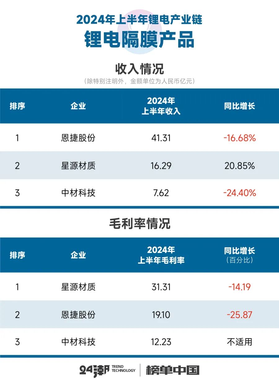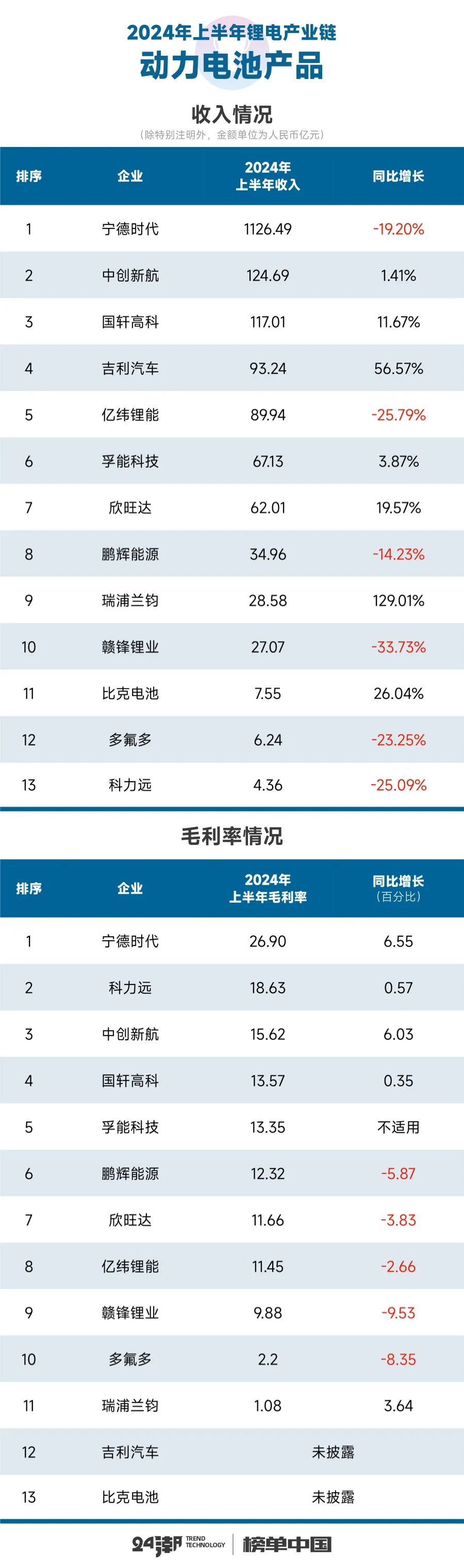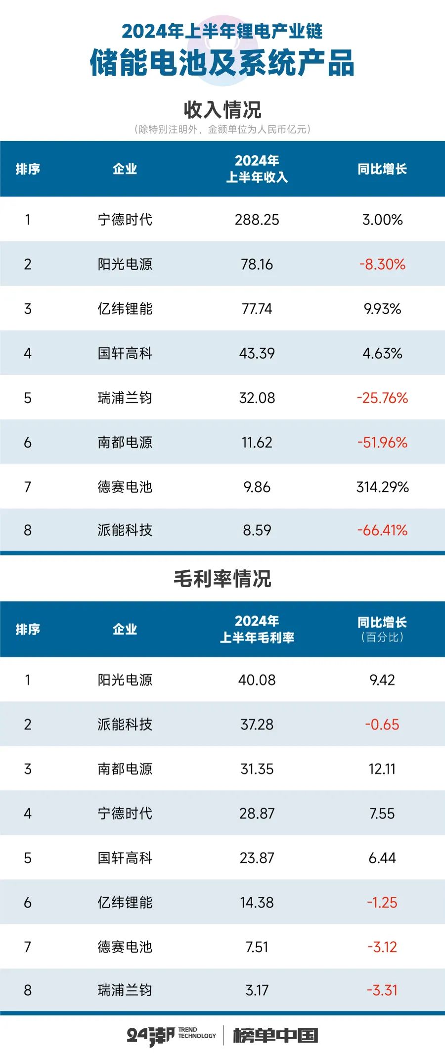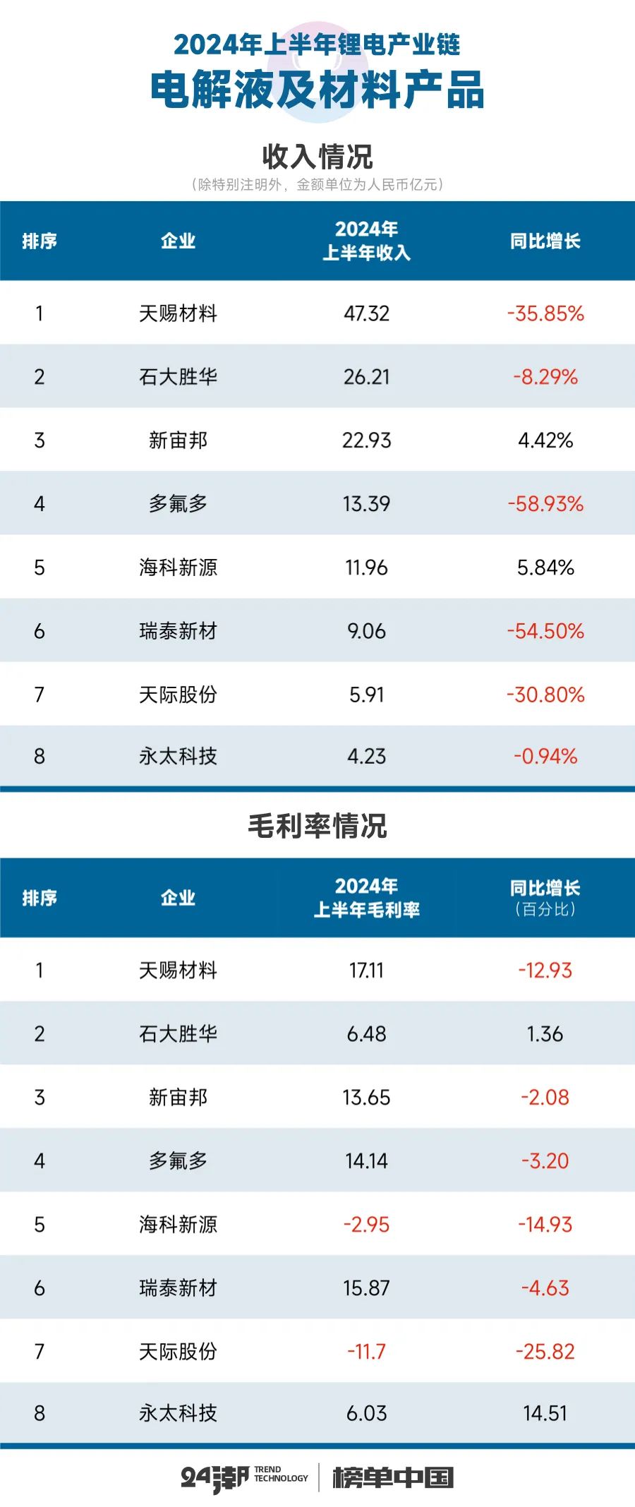 事实上,这一切已经在企业最新财报(2024年半年报)中有所体现。据24潮产业研究院(TTIR)统计分析100多家锂电上市公司财报发现,2024年上半年整个锂电产业链上市公司营业收入合计为4708.10亿元,约同比下降了20.21%;整体毛利率为18.94%,约同比下降了2.26个百分点。