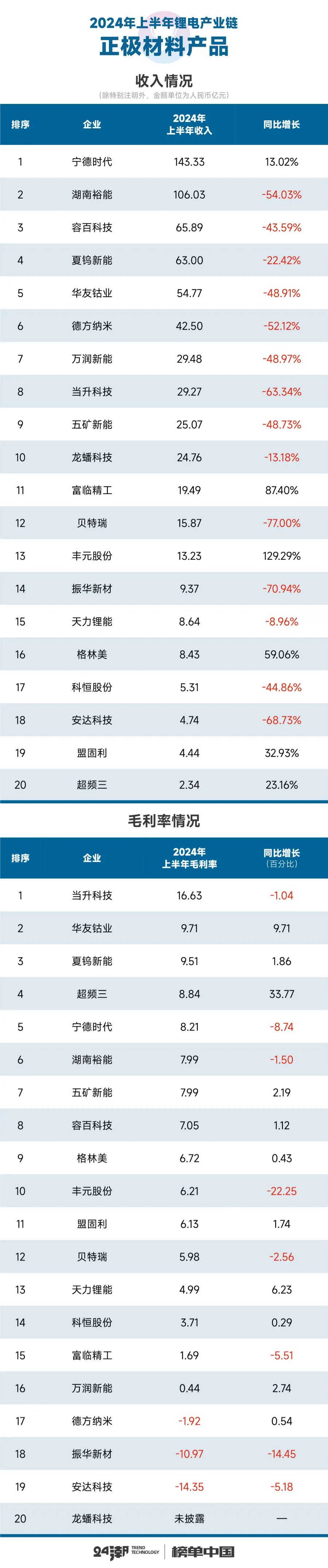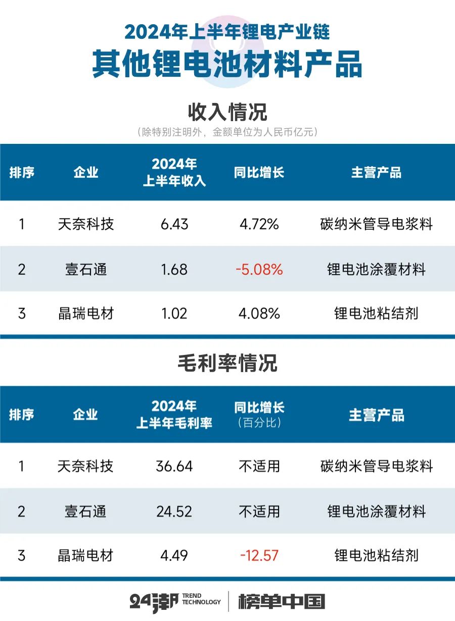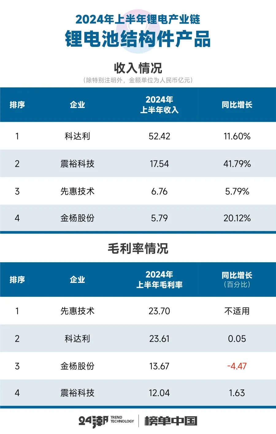 事实上,这一切已经在企业最新财报(2024年半年报)中有所体现。据24潮产业研究院(TTIR)统计分析100多家锂电上市公司财报发现,2024年上半年整个锂电产业链上市公司营业收入合计为4708.10亿元,约同比下降了20.21%;整体毛利率为18.94%,约同比下降了2.26个百分点。