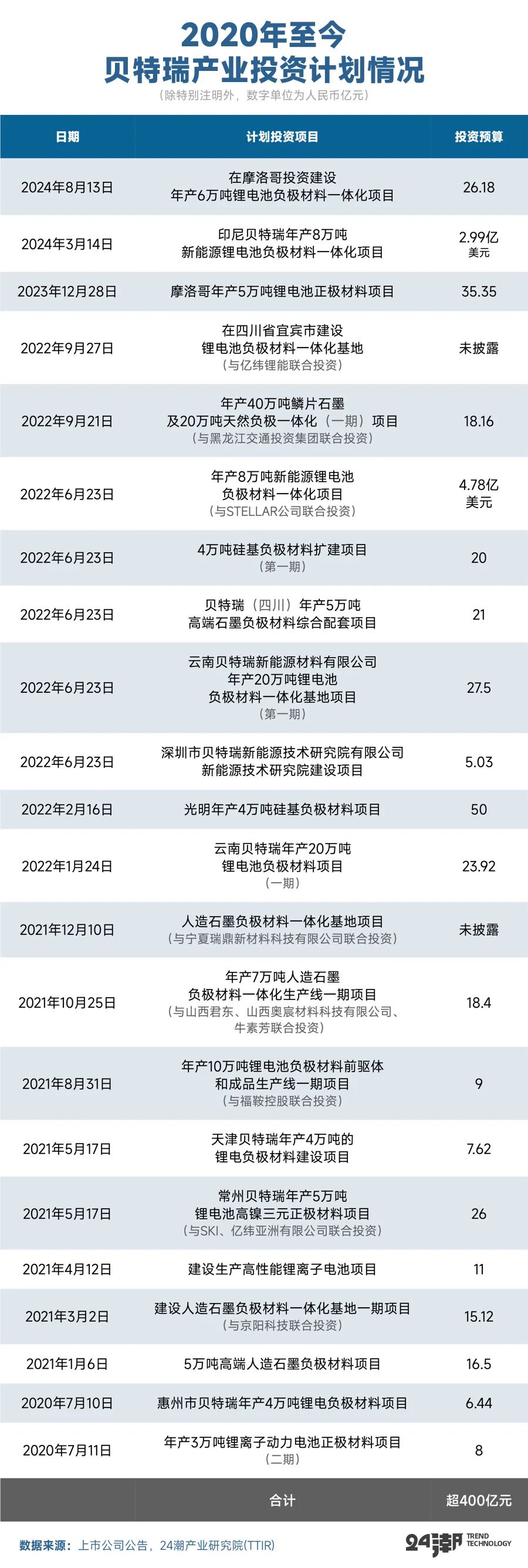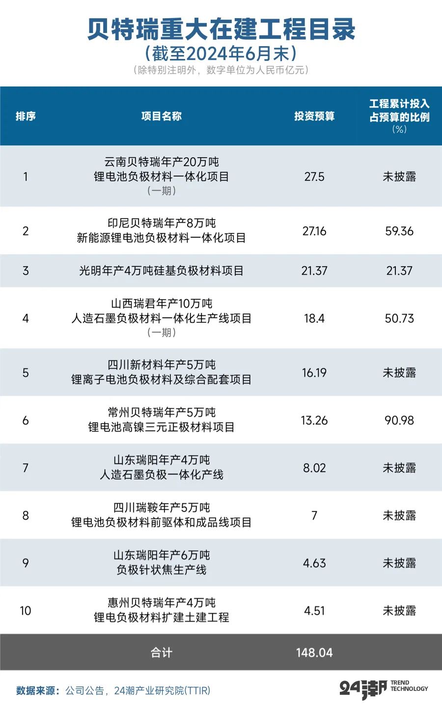 另据24潮产业研究院(TTIR)统计,截止2024年末,贝特瑞有10个超级工程进入执行,甚至收官阶段,项目总投资预算仅150亿元,从中可以看到正负极材料领域仍是其未来重点发展方向。