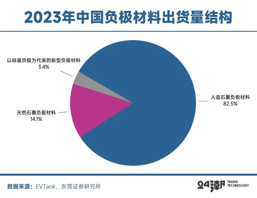在石墨材料的演进过程中,得益于循环性、稳定性良好,人造石墨逐渐成为绝对主流。2023年中国负极材料出货量中,人造石墨负极材料占比高达82.5%,天然石墨为14.1%。