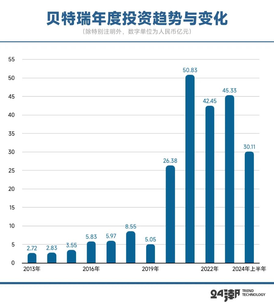 不止于战略,贝特瑞无疑也是个强力的行动派,据24潮产业研究院(TTIR)统计,过去12年时间(2013年-2024年上半年)合计对外投入(现金流)229.6亿元。尤其2020年以来,贝特瑞明显加速了扩张的步伐,2020年-2024年上半年,4年多合计对外投资达195.1亿元,是过去7年(2013年-2019年)的5.66倍。