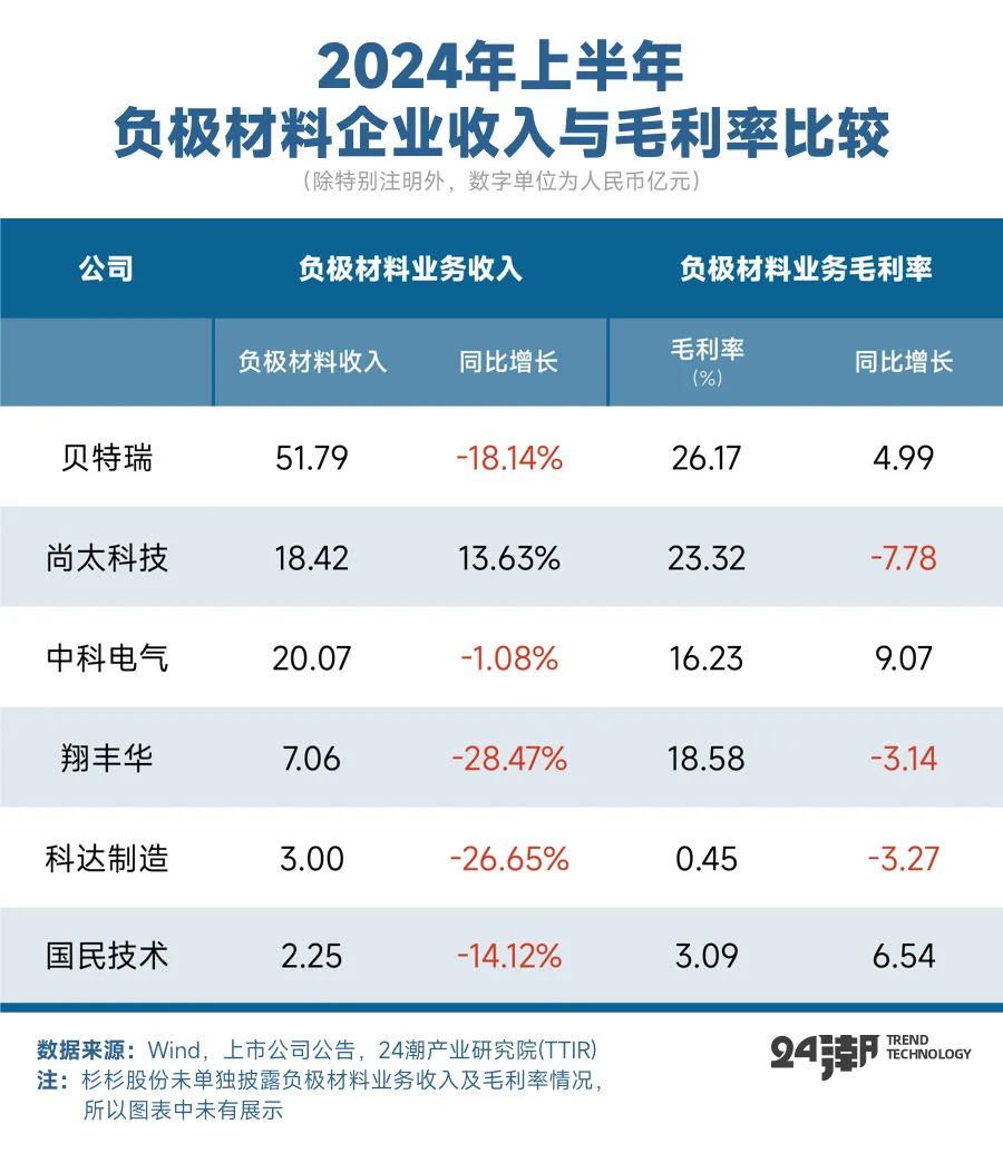 另外据24潮产业研究院(TTIR)统计,2024年上半年7家负极材料上市公司 “负极材料” 业务收入合计为219.28亿元,约同比下降了11.52%,7家公司近乎全线下降。
