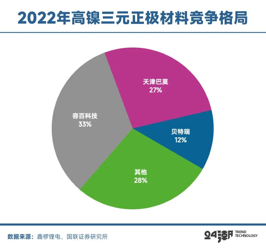 与此同时,贝特瑞攻入正极材料腹地,高镍三元正极材料出货量跻身中国前三,并形成负极+正极+先进新材料三大业务板块,2023年正极材料营收占比49.01%,首次超越负极,收入结构趋于平衡。