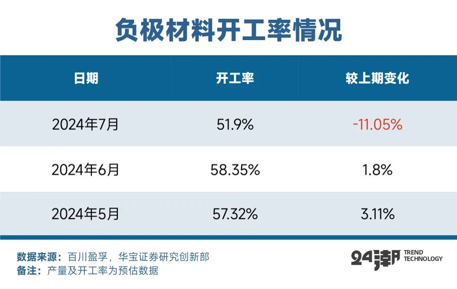 2024年初至今,负极材料价格全线下滑,供应量远超过市场需求,造成了供需失衡的局面。上海钢联数据显示,2023年负极材料产能256万吨,生产产量121万吨,开工率仅有50%左右,出货量143万吨,而全球下游需求仅有136万吨,产能结构性过剩已经十分明显。华宝证券测算,今年7月全行业开工率也只有52%,行业仍在艰难的去库存阶段。