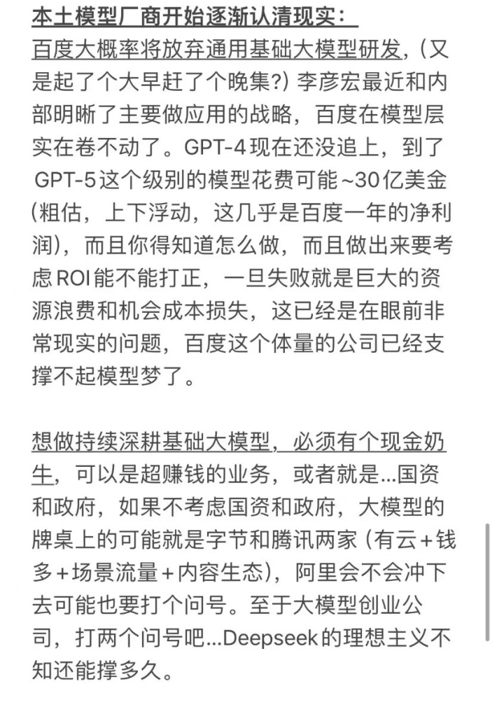 所谓的传闻来自一篇帖子:“百度大概率将放弃通用基础大模型研发,(又是起了个大早赶了个晚集?)李彦宏最近和内部明晰了主要做应用的战略,百度在模型层实在卷不动了。”