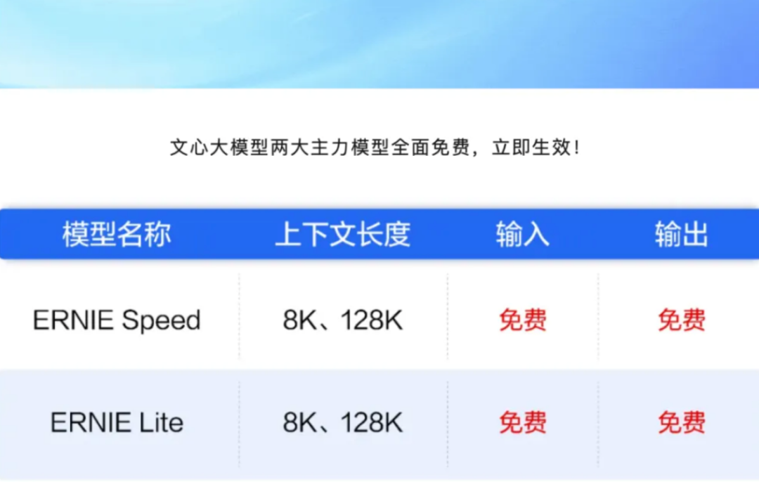 今年5月,百度智能云宣布ERNIE-Speed、ERNIE-Lite、ERNIE-Tiny系列模型预置服务对客户免费开放使用;今年7月WAIC期间,百度智能云宣布ERNIE 4.0、ERNIE 3.5两款旗舰模型大幅降价,ERNIE 4.0 Turbo面向企业客户全面开放,输入输出价格分别低至0.03元/千Tokens、0.06元/千Tokens。
