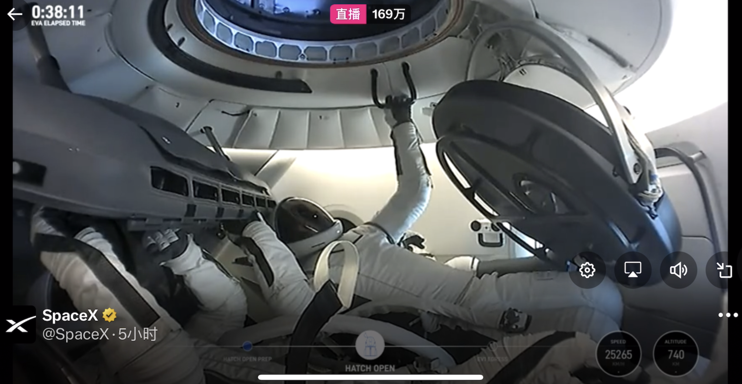 SpaceX的直播中,还展示了龙飞船的内部视图。当地时间近8时,该公司发文称,“北极星黎明号”太空行走现已完成,这是商业宇航员首次从商业航天器上完成太空行走。同时,SpaceX对四位宇航员以及SpaceX 团队表示了祝贺。