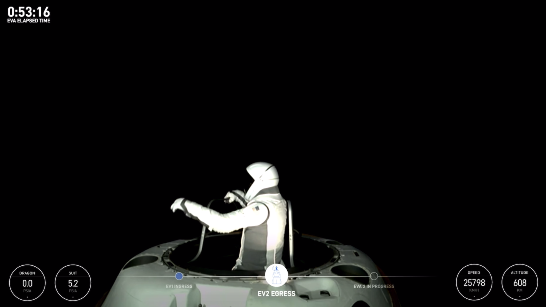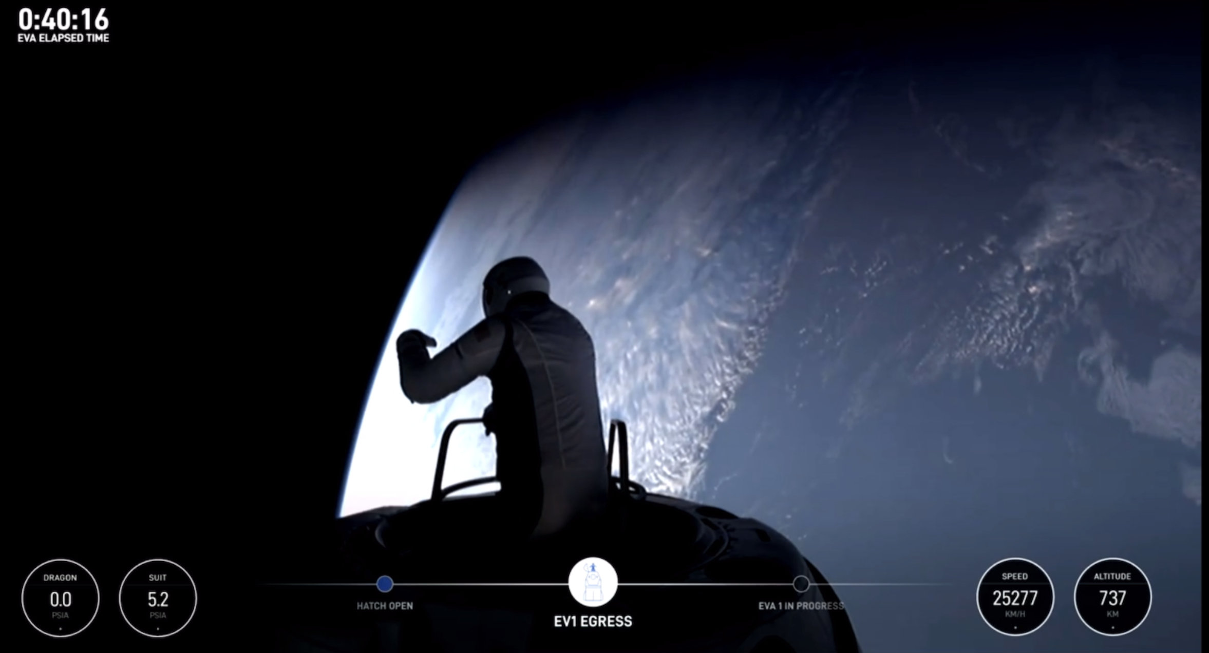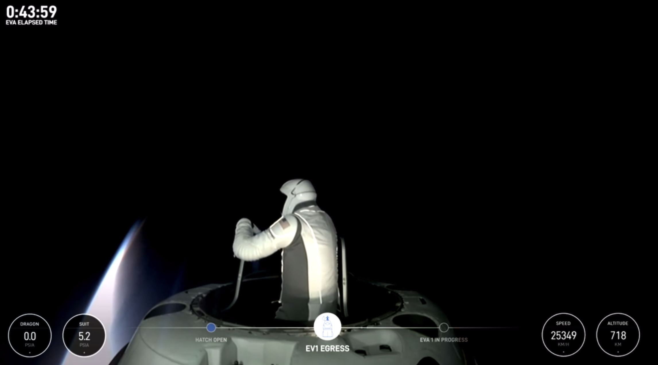 身着SpaceX设计的白色舱外活动太空服,艾萨克曼率先出舱。从直播中可以看到,他借助“天行者” (Skywalker)梯子的扶手,大半个身子探出舱口,身后约3.6米的缆绳保护他与飞船的相连。艾萨克曼的出舱总时长近10分钟,之后安全返回龙飞船内。紧接着,工程师吉利斯出舱,她也是首位私人进行太空行走的女宇航员。