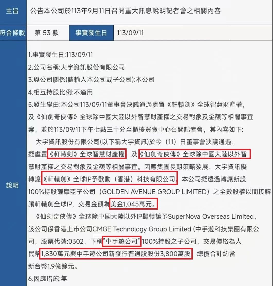 9月11日,中国台湾游戏公司大宇资讯发布公告称,已将旗下两大王牌IP——“轩辕剑”全球知识产权(IP)以及“仙剑奇侠传”全球除中国大陆以外知识产权售出,合计售出价格约5亿新台币(当前约人民币1.19亿元)。