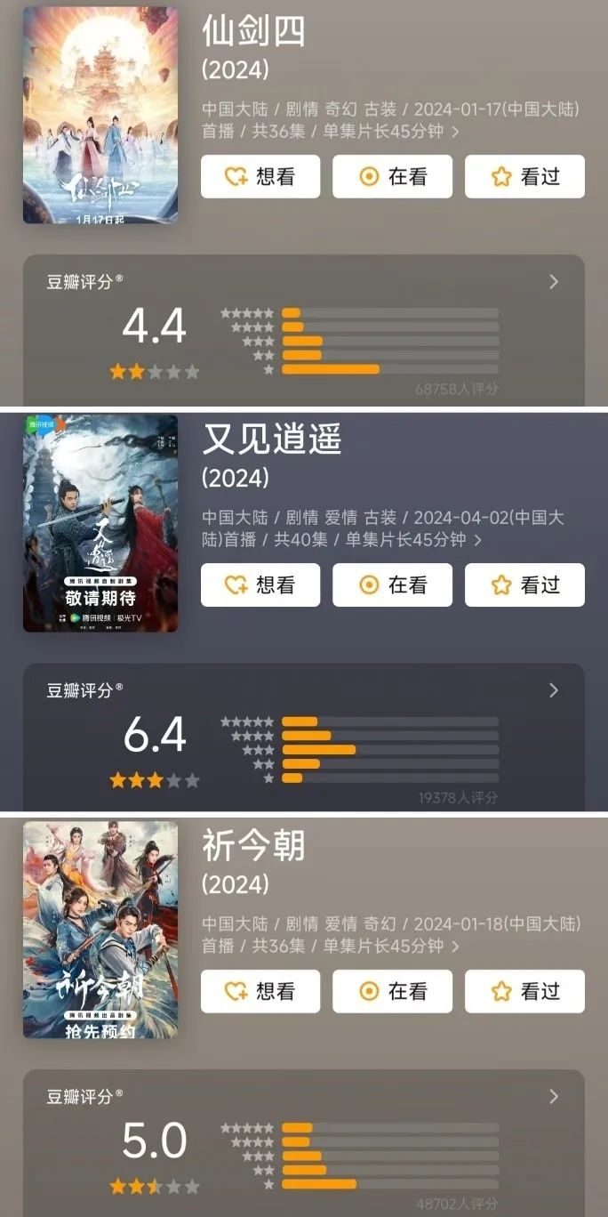 其中,影视内容方面,2024年上半年,中手游联手爱奇艺、万达、新文化推出的影视剧《仙剑四》于1月上线爱奇艺平台,历史最高热度达7835;同期,与腾讯视频、山东影视、百纳千成及乐呈影业合作,基于《仙剑奇侠传六》改编的《祈今朝》于腾讯视频上线,站内热度突破24000。两部影视作品在春节档开播吸引了众多观众的目光,不过两部剧的口碑都欠佳,豆瓣评分分别仅有4.4分和5.0分。4月,中手游与腾讯影视合作基于《仙剑奇侠传一》改编的影视剧《又见逍遥》上线,站内热度突破21000,但豆瓣评分也仅有6.4。尽管今年以来接连推出的三部影视作品播放及口碑表现不佳,但从开播前的讨论热度仍可以看出“仙剑”IP极高的国民认知度。