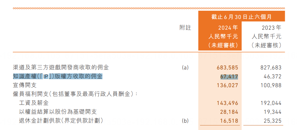 除了“仙剑”IP外,中手游拥有庞大的IP储备资源库,截至2023年末,其共有128个IP,其中授权IP有60个、自有IP有68个。自有IP赚钱,但授权IP则需支付大量的佣金。仅2024年上半年,中手游支付的IP佣金便高达6741.7万元。