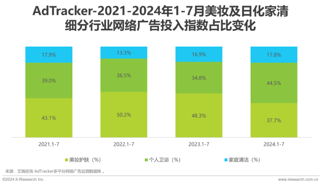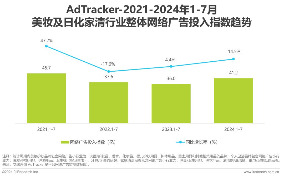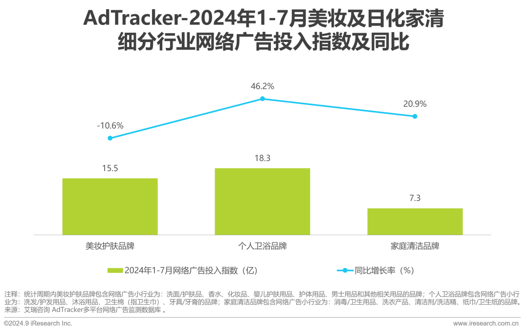 2024年1-7月,美妆及日化家清行业网络广告投放持续增长,投入指数为41.2亿,同比+14.5%,其中个人卫浴类和家庭清洁类的增长尤为显著,美妆护肤广告投入同比减少。