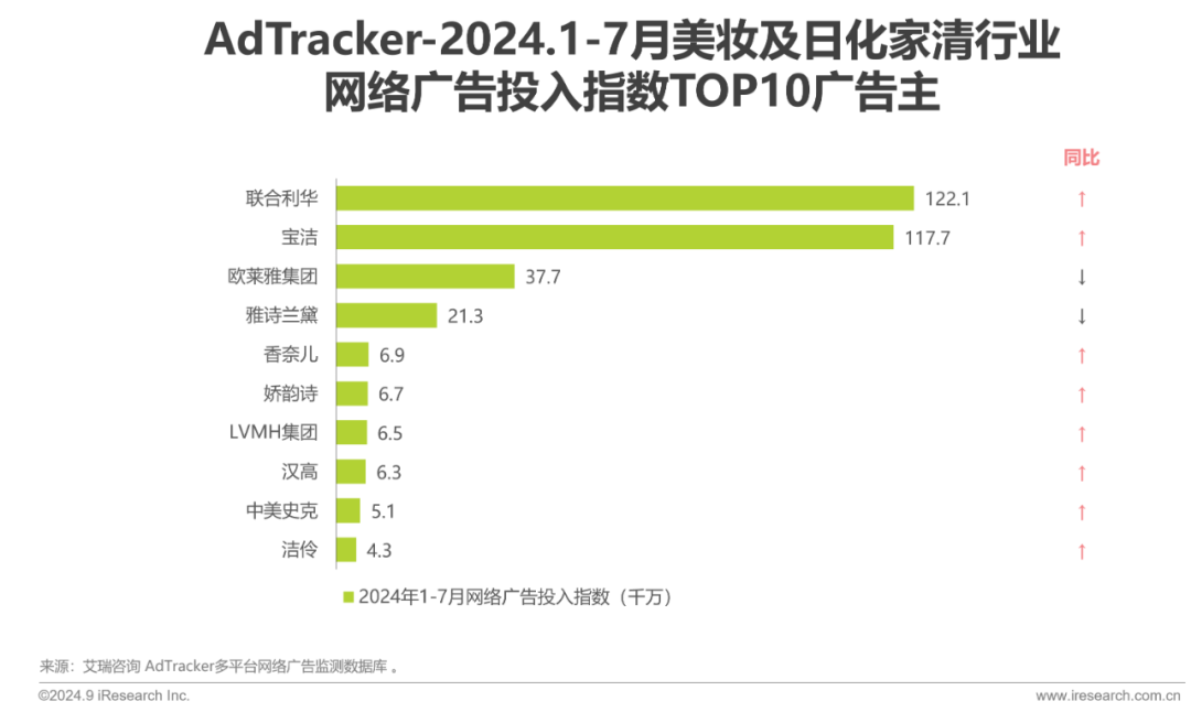 美妆及日化家清行业广告投入增长榜